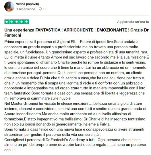 Charlie è una persona dinamica e poliedrica, ha avuto tante esperienze nella sua vita e credo che questo sia un elemento fondamentale per ogni professionista di successo. Grande conoscitore dell'ipnosi e dei più avanzati costrutti e modelli in grado di aiutare le persone. Sempre in prima linea nei promotori del cambiamento. Posso solo augurarti di metterti in contatto con lui.